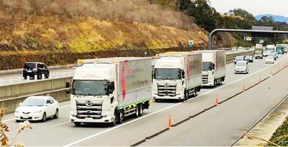 後続車を無人にした短車間距離での隊列走行を実現することにより、ドライバー不足の解消や大幅なCO2排出量の削減が期待されます。当社では、国家プロジェクト(エネルギーITS推進事業)で開発された隊列走行技術(全車有人)をベースに、バスやトラック等の中大型車の後続車無人走行車両の実用化を目指しています。